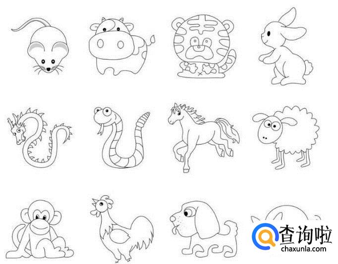 十二生肖分别为一鼠、二牛、三虎、四兔、五龙、六蛇、七马、八羊、九猴、十鸡、十一狗、十二猪。这十二种小动物我们除了龙没见过,其他十一种动物我们应该都见到过。也正是因为如此,龙是十二生肖中最好画的。接下来,我来和大家一起画一下这十二只小动物的简笔画。