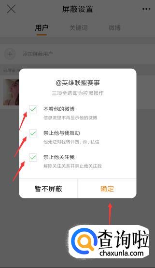选择屏蔽选项,我们【全部屏蔽】,你可以不选择禁止它关注我不要选,别人一般不会发现你屏蔽了。