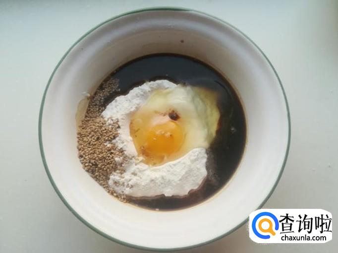 把红糖化成红糖水,放盆里,加入面粉,鸡蛋,芝麻。