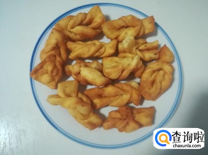 把捞出来的花样沥油后,放入盘子里,这样油炸面食花样就做好了。
