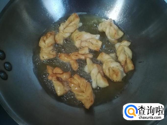 等花样的两面全部炸成金黄时,用漏勺捞出。