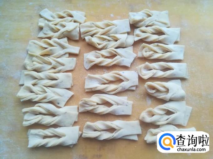 再把两个小长条重叠在一起,从中间翻成图的样子,制成花样生坯。