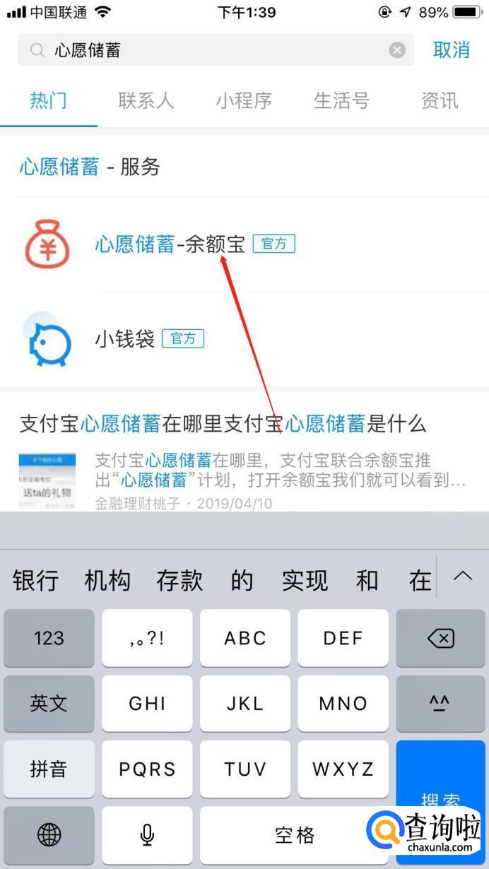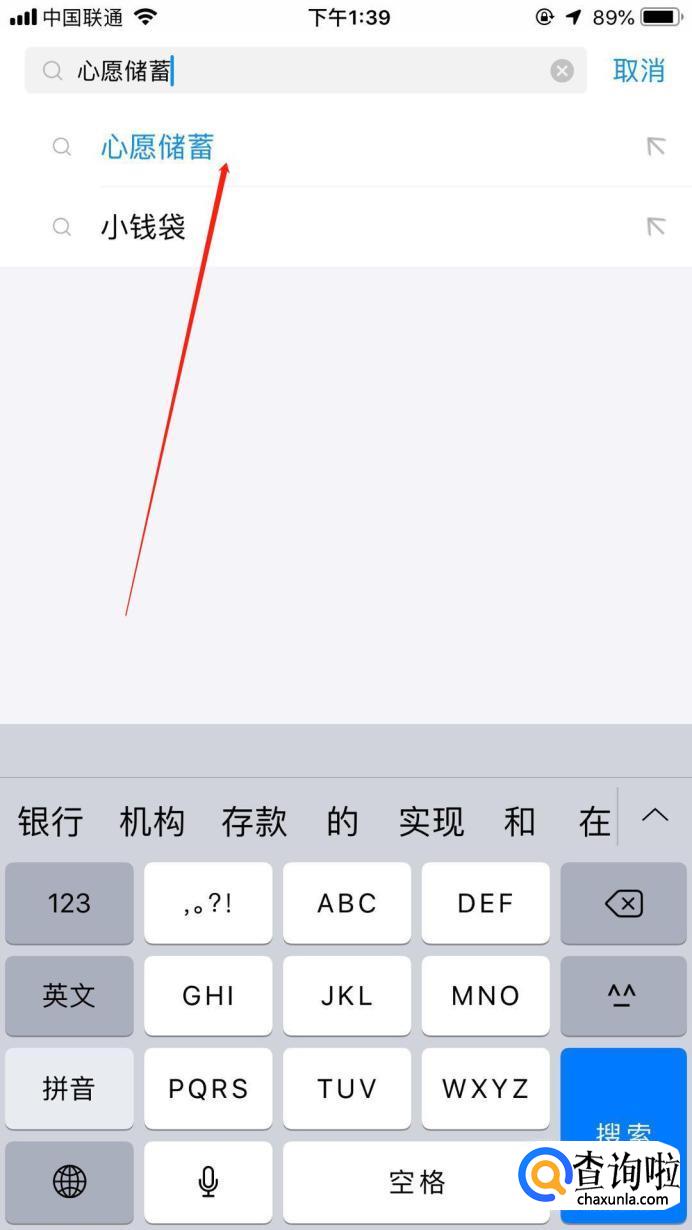 在主页上方的搜索栏里输入“心愿储蓄”,然后点击第一个选项“心愿储蓄”。