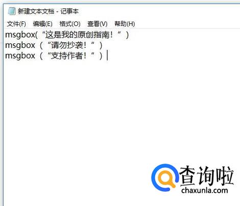 打开文本文档,将输入法切换至英文,输入:msgbox(“这是我的原创指南!”),如图所示。