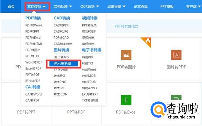 我们在首页后面会有一个文档转换,鼠标触碰会出现一个下拉框,在下拉框下有Word转长图的按钮。
