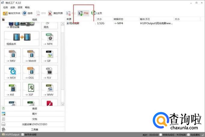 接下来,在软件主页面中的任务列表中,点击“开始”按钮,然后开始进行视频文件格式的转换。