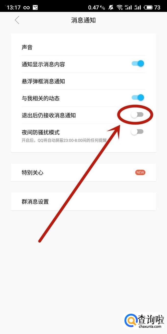 进入之后,将“退出后仍接受消息通知”的开关打开,如图所示。