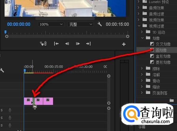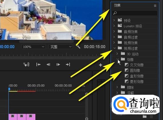 再在右侧的效果面板中,点开视频过渡文件夹,再从中找到自己想要的过渡效果。