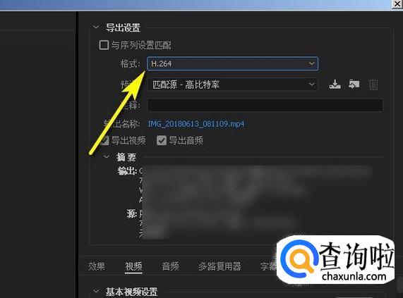图片之间添加转场效果后,按下CTRL+M,调出导出设置面板。并把格式设置为:H.264
