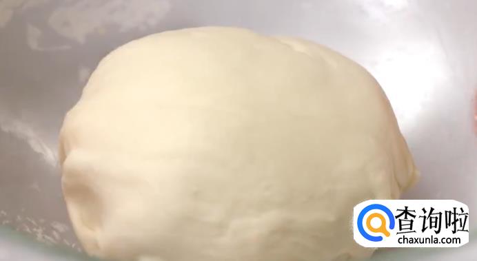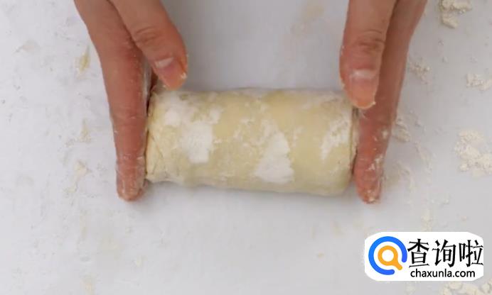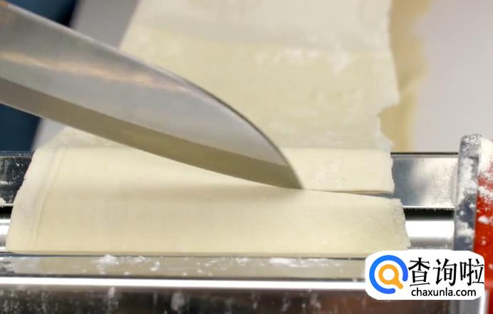 取出面团,压至压面机口合适大小。然后放进压面机压制,注意要不时撒粉,防止粘连。一直压到合适的厚度,割断成两个长条。