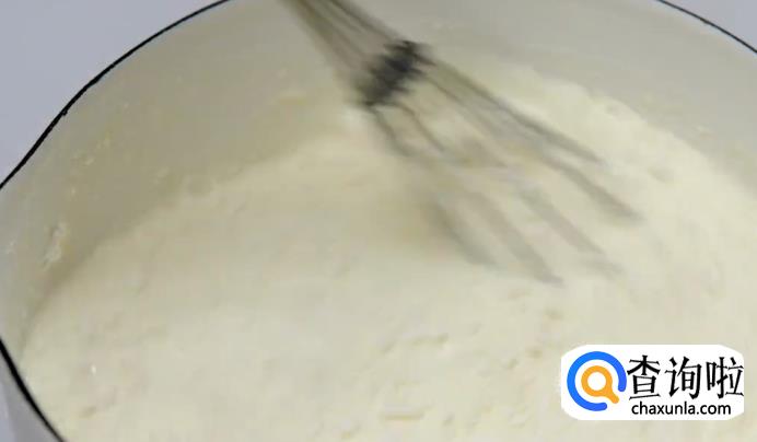 首先将牛奶、淡奶油、低筋面粉倒入锅内搅拌,小火加热至浓稠之后,继续搅拌两分钟,关火。