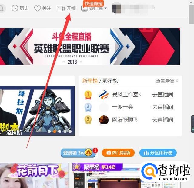 进入之后登录你的账号,如果你没有账号注册一个然后登录,登录之后在你头像的左边有一个开播,然后点击