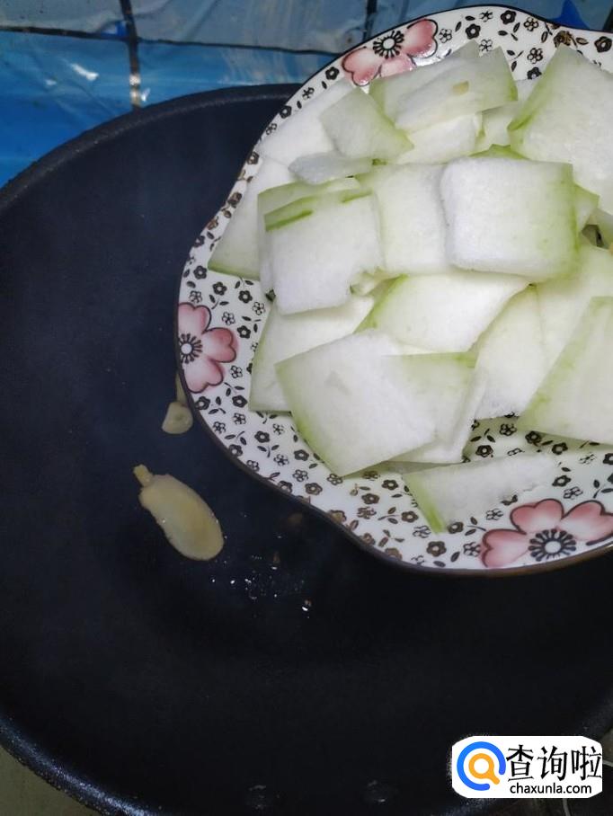 将准备好的冬瓜片儿,倒入锅中,翻炒均匀,炒至冬瓜微微透明,就差不多了。