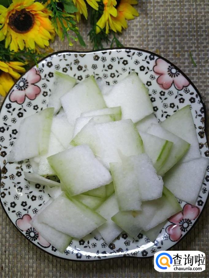准备一块冬瓜,洗净去皮后,切片,放入盘中备用。