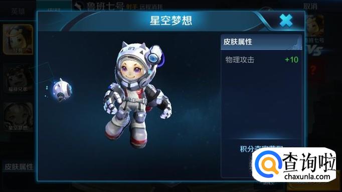 最后是星空梦想。这个皮肤的话是新出来的,需要积分夺宝才可以获取,同样是增加10的物理攻击。但是小编认为后面的这两个皮肤要更好看一点。