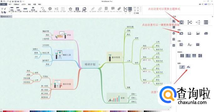空白的背景显得太单调,不适合作为PPT演示,所以我们可以美化一下我们的思维导图,可以从样式中心挑选合适的模板进行一键替换,也可以自定义为分支和主题更换颜色。