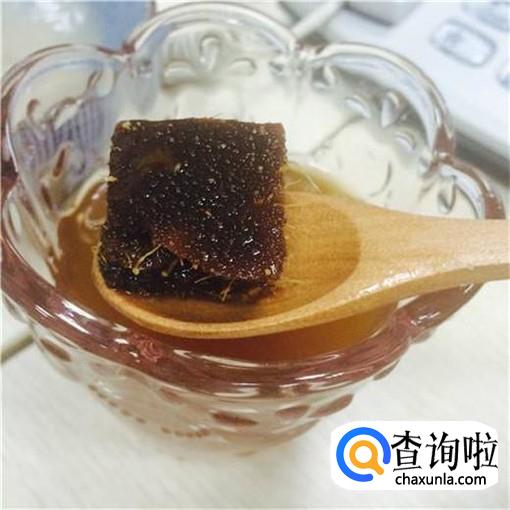 这时候我们就要开始进行冰粉的调味了,我们取一块红糖,然后溶解在适量的温水中,就制作好了冰粉的红糖水。