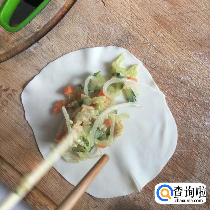 然后把炒好的馅平铺在饺子皮上,随便包一下就可以了。