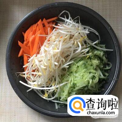 首先将一部分胡萝卜去皮切成丝,黄瓜切成丝,豆芽洗净。
