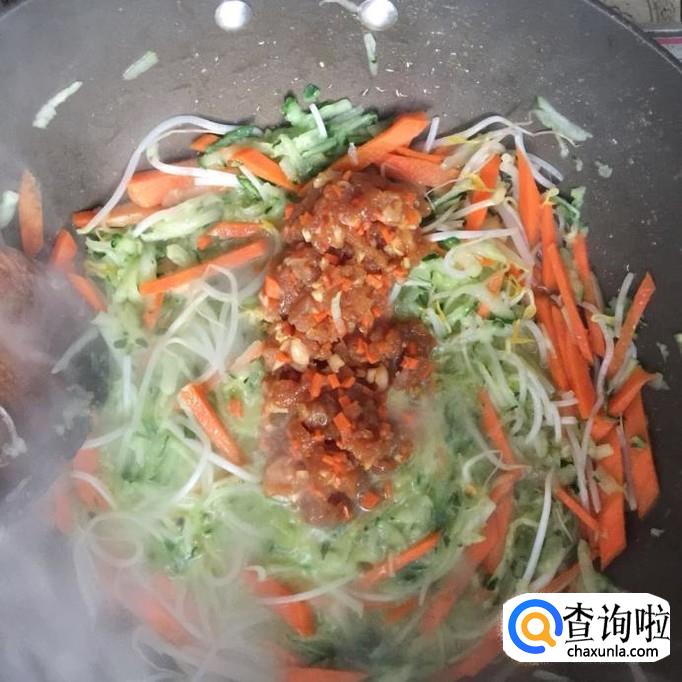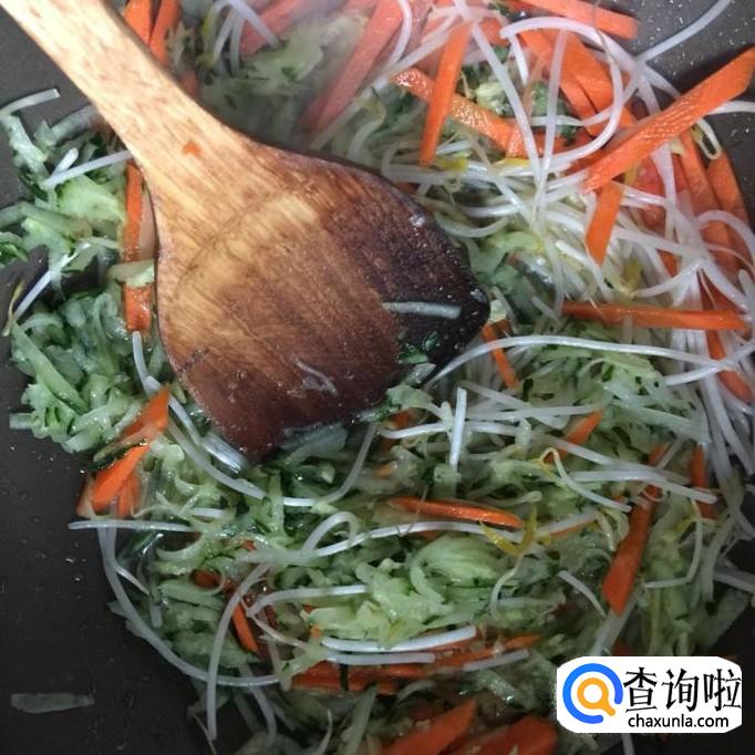 然后锅中放入适量的调和油,待油冒烟,倒入胡萝卜丝、黄瓜和豆芽,翻炒五分钟。