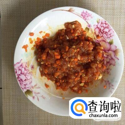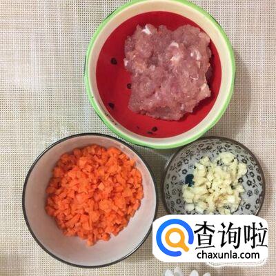 接着把瘦肉切成丁,蒜头切成蒜蓉,另外一部分胡萝卜切成丁,倒入碗中用适量的生抽搅拌均匀。