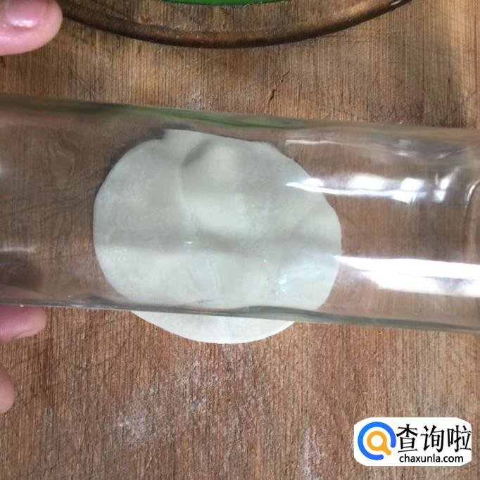 接着把饺子皮用玻璃瓶擀一下。注意擀饺子皮的时候,要保持相对圆形就可以了。小编之所以选择用玻璃瓶来擀饺子皮,那是因为玻璃瓶会比擀面杖会更好用一点。