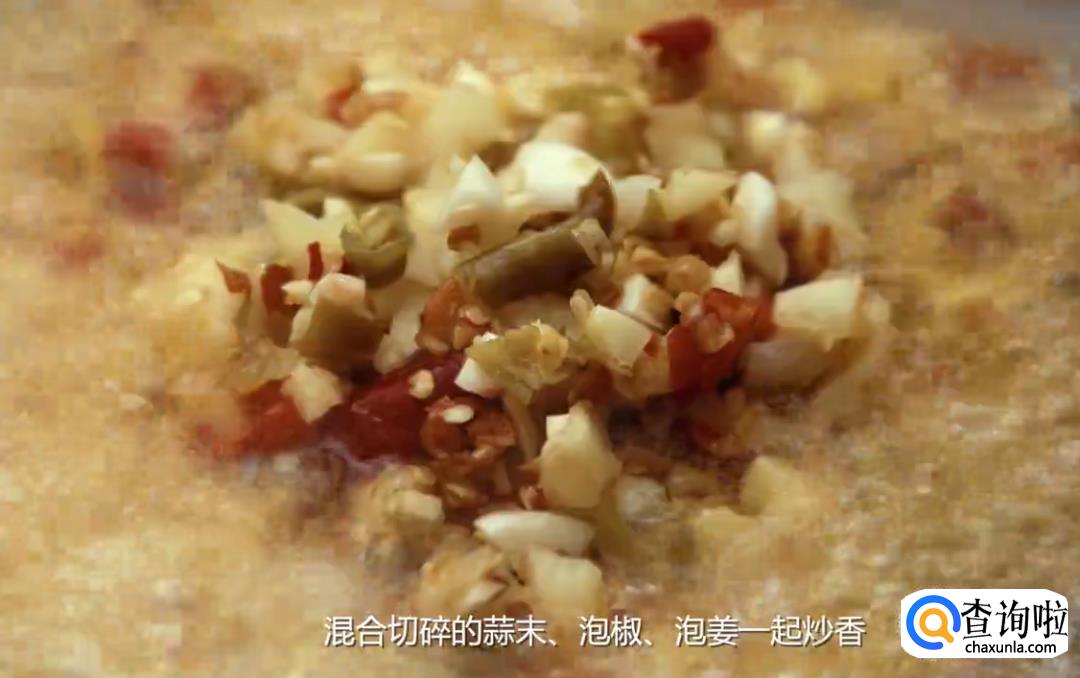 热锅倒油,放入花椒爆香后,放入一勺豆瓣酱,混合切碎的蒜末、泡椒、泡姜一起炒香。炒料的时间要两分钟左右,直至香气冒出。