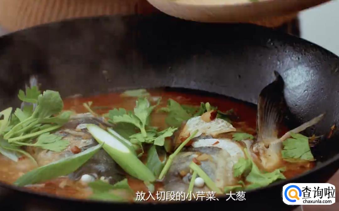 放入切段的小芹菜、大葱,再煮约1分钟,一盆热气腾腾的家常黄焖鱼头就做好了。