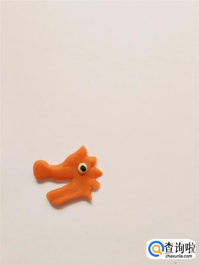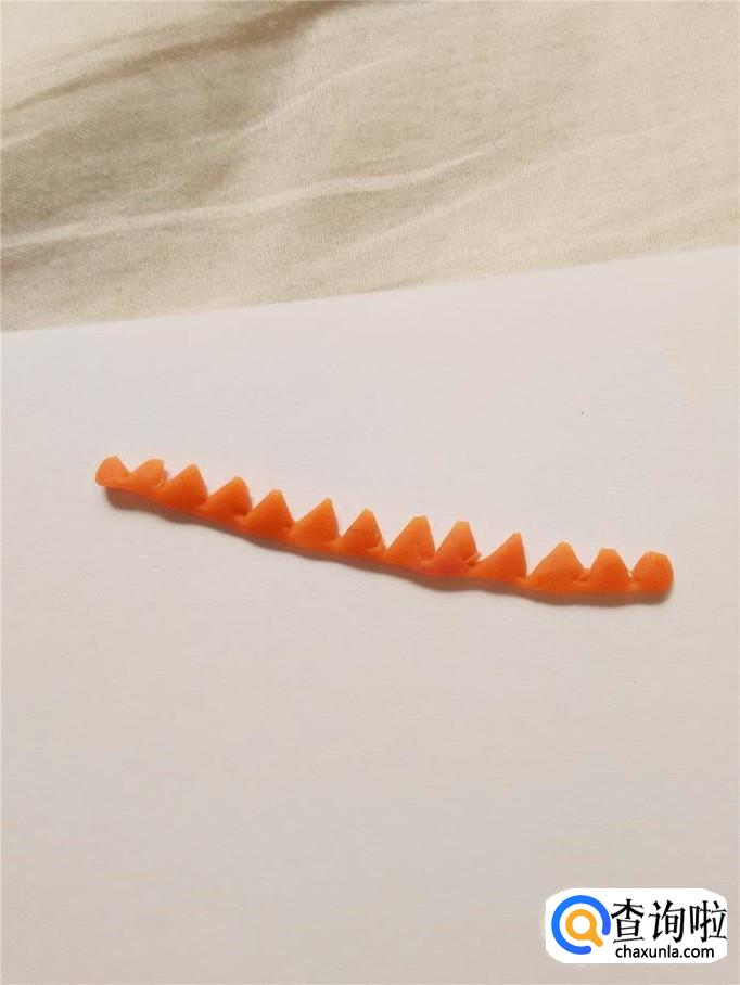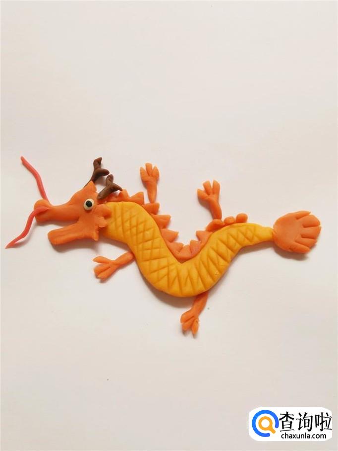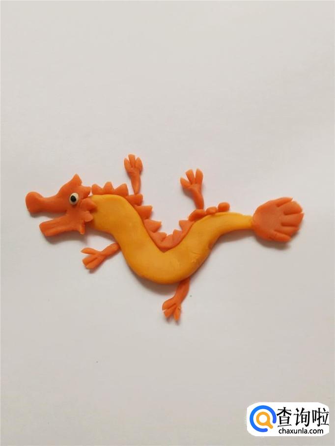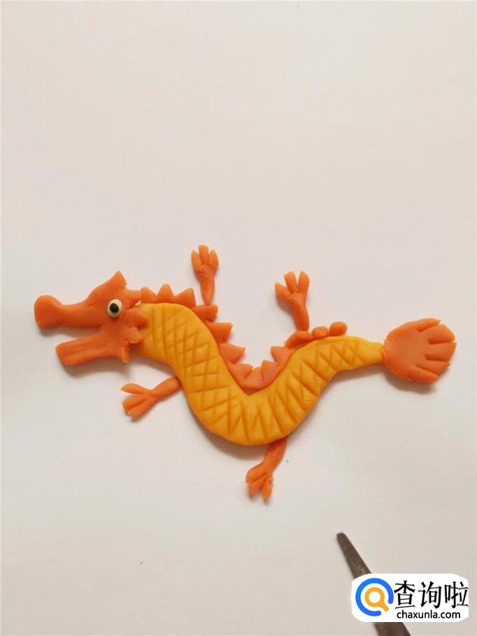 再用桔红色搓一个细长的条,按扁的,用剪刀剪成锯齿状,当作龙背上的鳍。