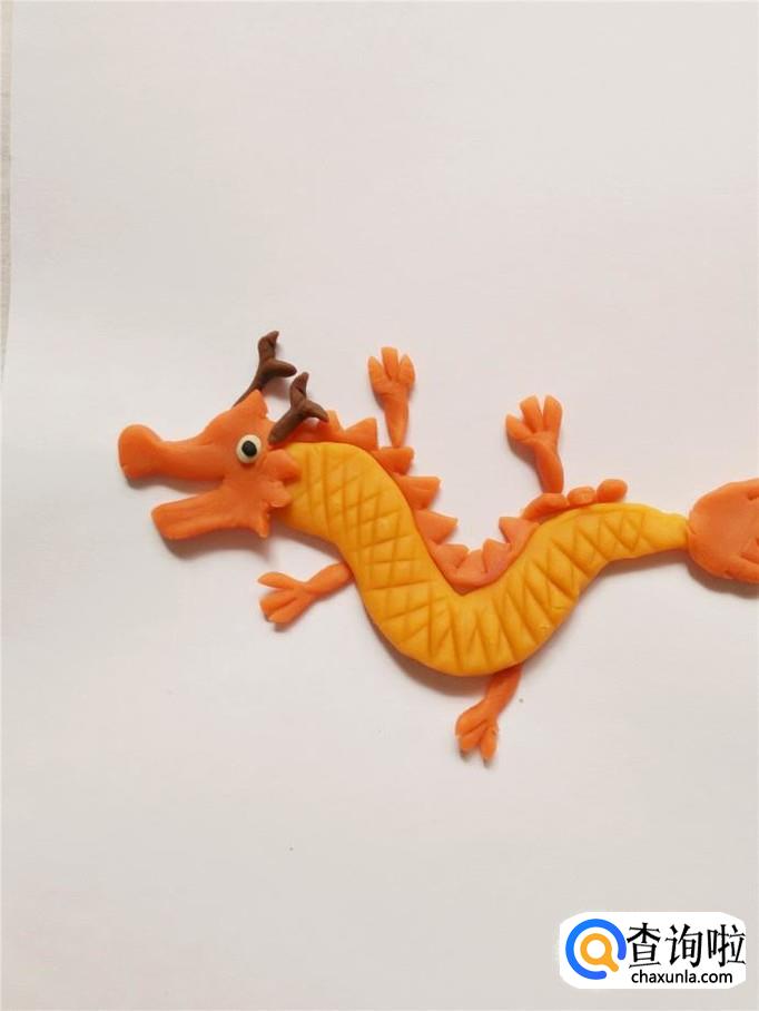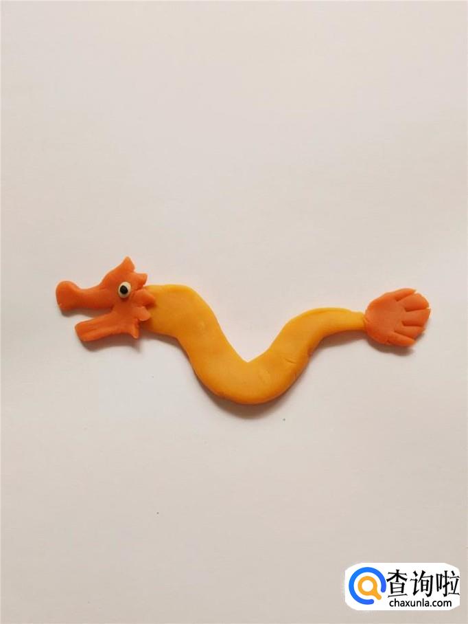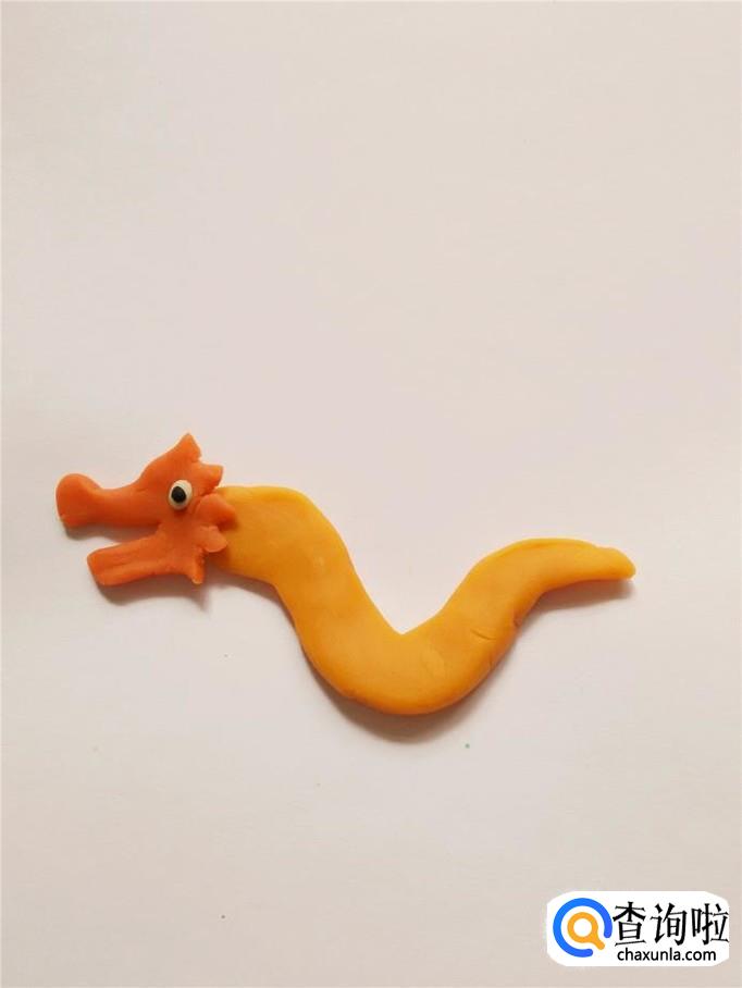 用桔黄色搓一个长长的条,按扁,粘在头部右侧,当作龙的身体。