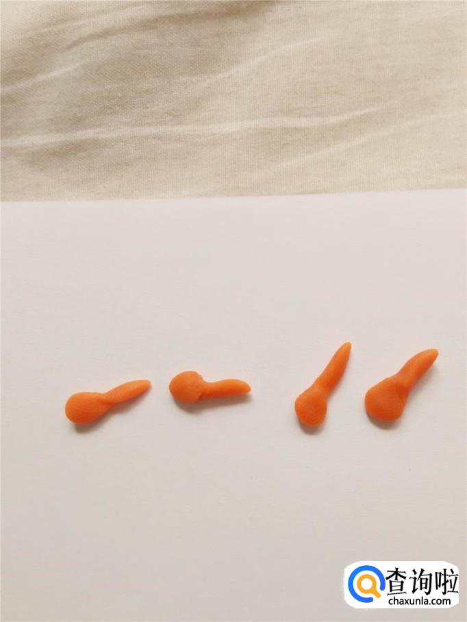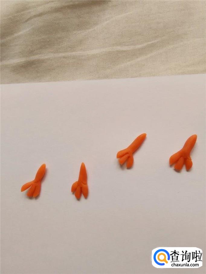 用桔红色搓四个棒棒糖形状,当作龙的腿,用剪刀在每个龙腿末端剪两剪子,剪出爪子。
