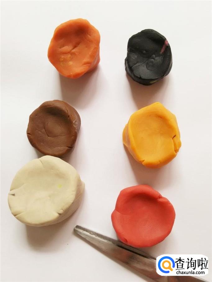 用白色团一个小球,按成扁片,当作眼睛,再用一小块黑色团成一个小球,粘在白眼睛上面,当作眼珠。