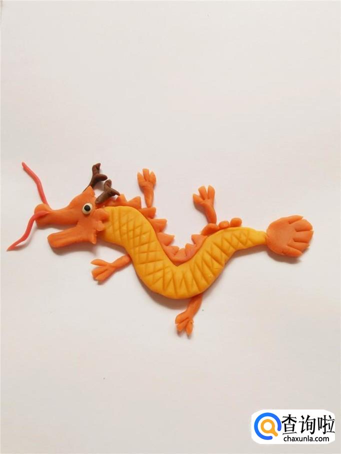 最后用红色搓两个细长的条,粘在龙的鼻子上面,并且弯曲一下,当作龙的触须。超轻彩泥龙就做完了。