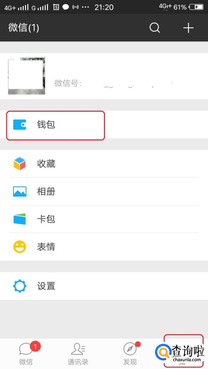 首先,打开手机微信,如图所示,点击“我”,点击“钱包”。