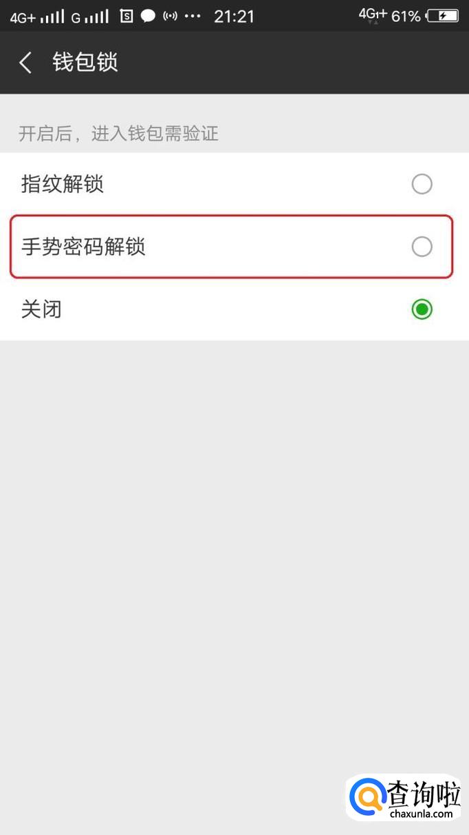 可以采用指纹解锁和手势密码解锁两种方式开启钱包锁,我们选择“手势密码解锁”,这个比较简单。