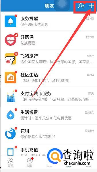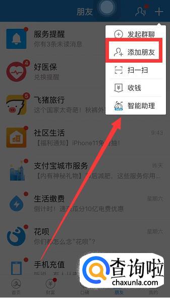 打开支付宝,找到下方第四个【朋友】。
