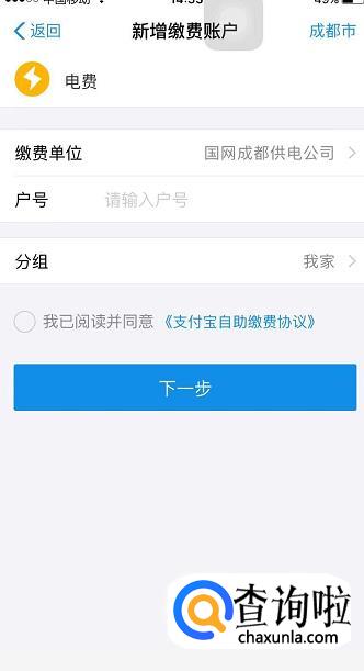 如果是首次缴费的话,是需要新增缴费账户才能缴费的,选择我们所在区域,然后输入自家的户号,点击同意《支付宝自助缴费协议》,然后点击“下一步”。
