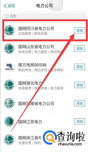 之后支付宝会根据你的定位为你推荐你所造地区的电力公司,我们举个例子选择四川的电力公司,点击关注。