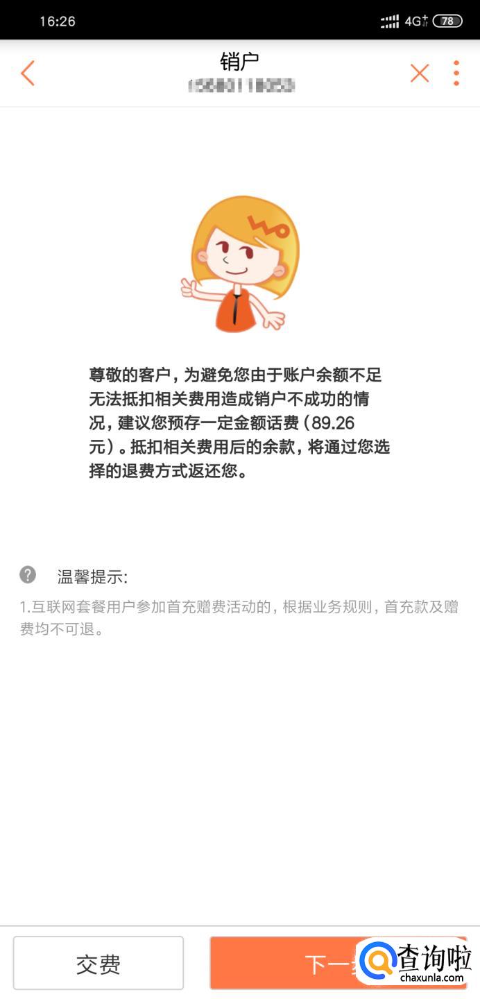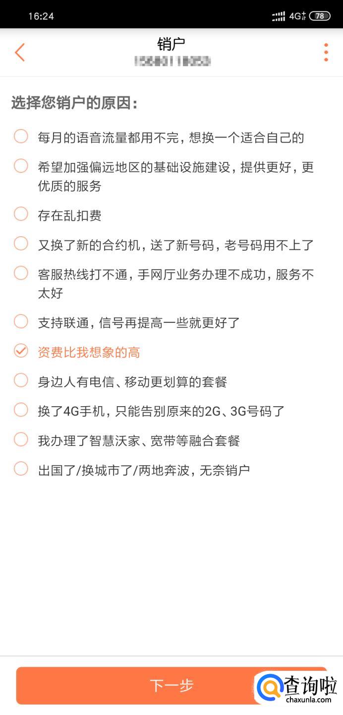 进入销户首页如下图所示,选择销户原因。点击【下一步】可进入页面。