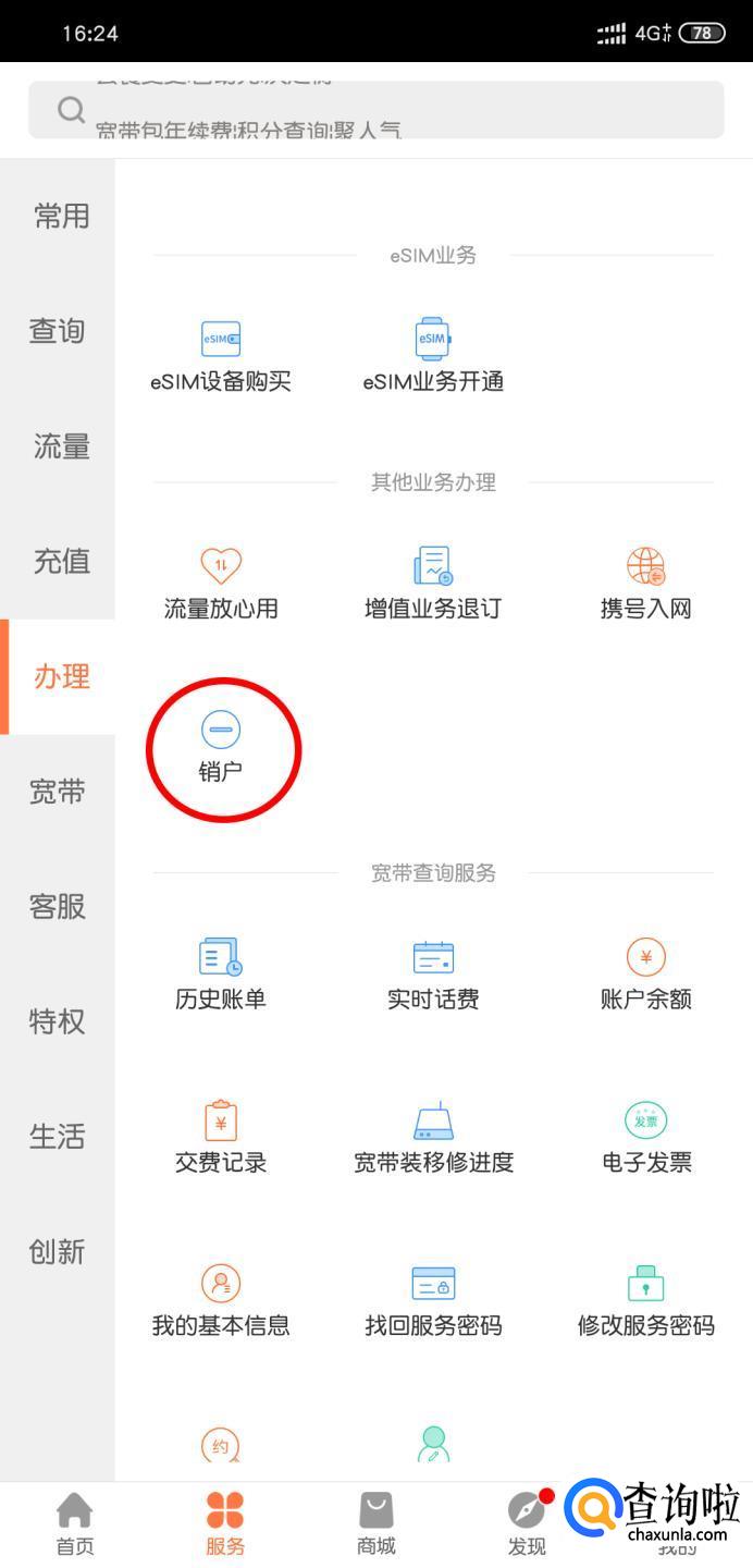 密码登录手机营业厅,选择服务>办理>销户业务。
