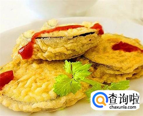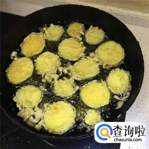 锅里面放上油烧热,改成中火,把茄子片放进面糊中,两面都是面糊,然后放进锅里炸,两面金黄的时候捞出来控油。