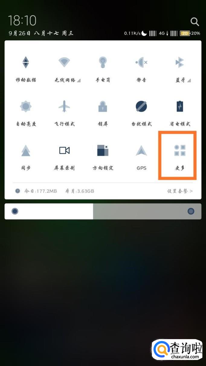 在桌面向下拉状态栏,点击如箭头所指的“更多”功能。
