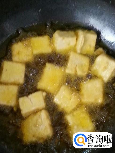 将锅烧热,放适量的植物油,将油烧热,然后,将盘中的豆腐放入热油锅中炸至金黄,即可捞出。