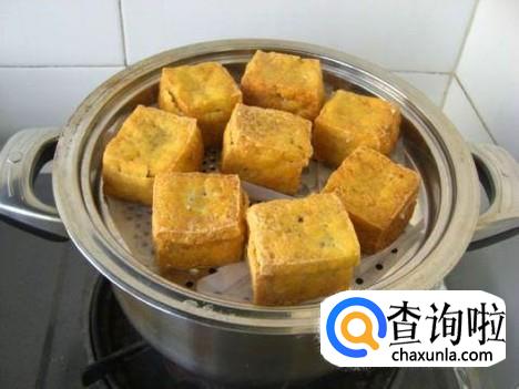 将盘中的豆腐箱子放入锅中蒸煮,煮至锅开且馅料熟透之时即可出锅。