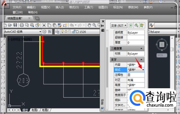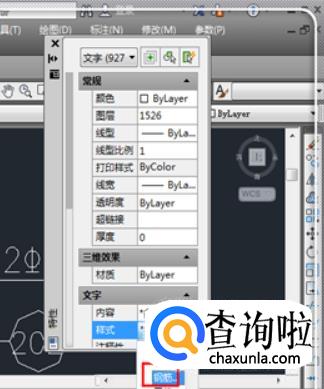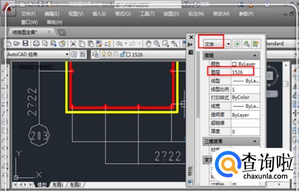 这里是有问号的字体,点击它,选择,然后使用点击右键,选择“特性”,进入改文字的特性表中,或者是组合键“ctrl+1”进入也可。进入特性表之后,这里需要记住三个重要信息,一个是最上方的“文字”(当然你的可能是其他的,以你的为准),然后是“图层”后面的“1526”(你的可能不同,以你的名称为准)。点击一下esc键去掉文字选中。