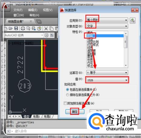 进入快速选择界面,这里选择刚才记下的三个重要信息,在“对象类型”选择“文字”(你的以你刚才记下的为准);“特性”选择“图层”;值选择“1526”(你的以你刚才记下的为准),点击“确定”。