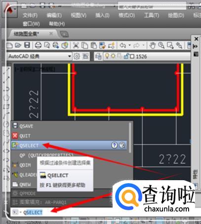 在命令栏输入“q”,选择“qslect”,点击回车,当然也可以从“工具”-“快速选择”中调出来。