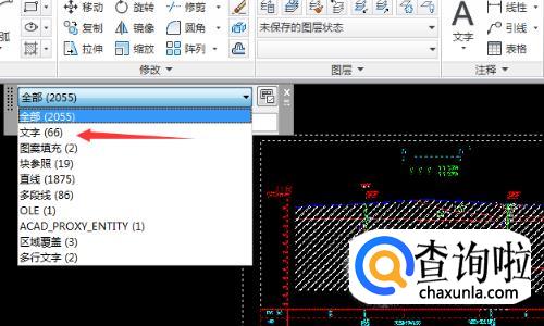 在图纸上点击鼠标右键,弹出菜单后选择“快捷特性,在弹出的菜单中,将“全部”菜单栏下拉,切换成“文字”菜单。