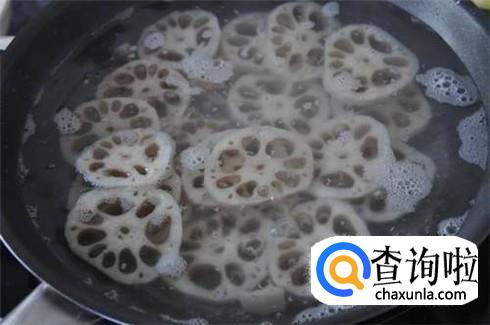 锅里烧开一锅水,水开后,放入两勺白醋,然后放入切好的莲藕片,烫几分钟,再捞起来。