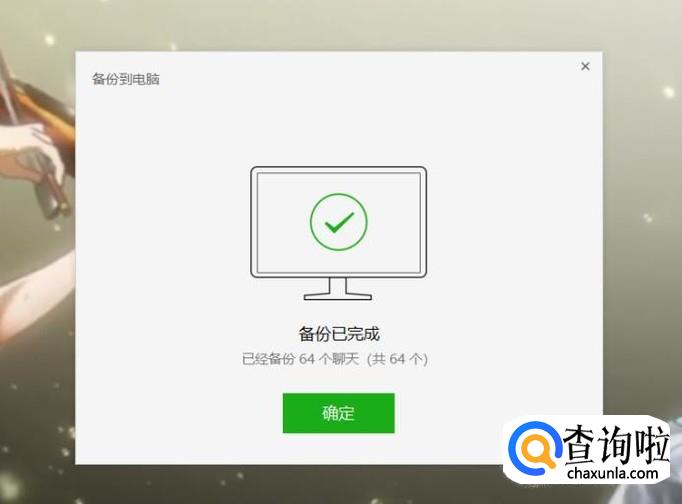 确认后,即可开始备份,完成后会弹出下图所示的提示,点击确认,这样,手机上的微信记录就已经在电脑上备份好了
